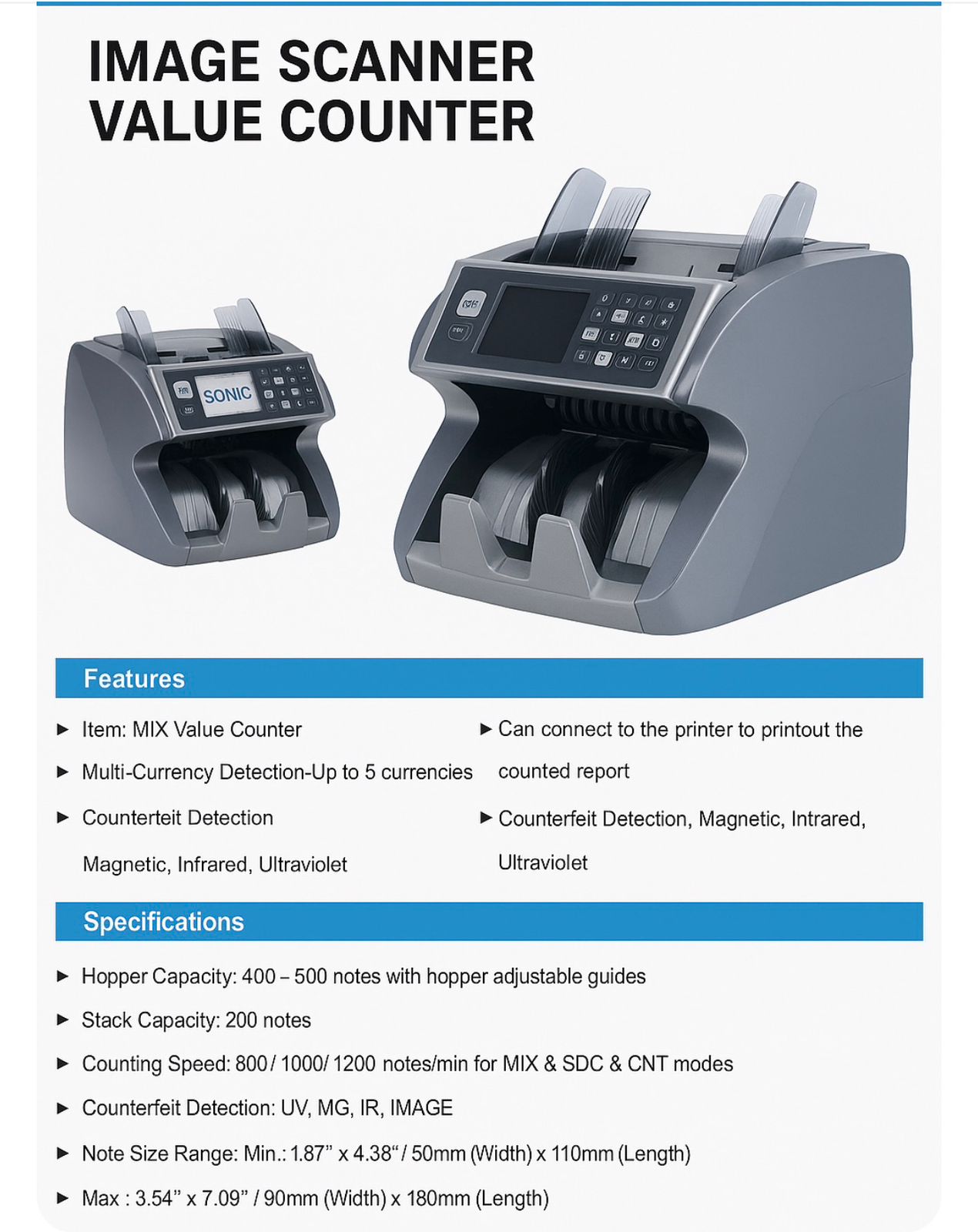 The Image Scanner Value Counter is a compact and efficient solution for accurate cash counting and counterfeit detection. Designed for businesses handling multiple currencies, this machine supports MIX value counting and can automatically detect up to 5 different currencies.