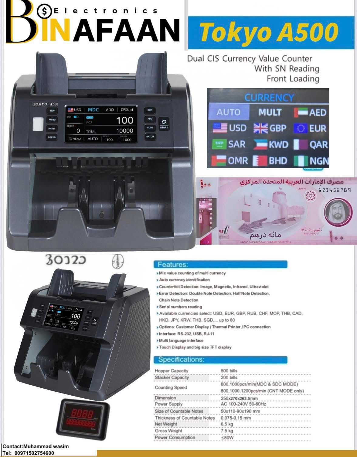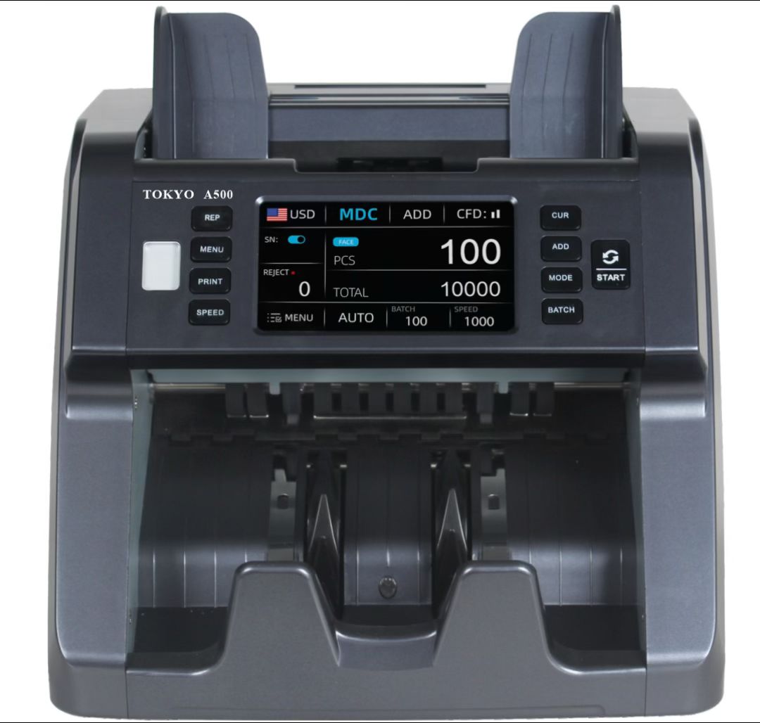 The Tokyo A500 is a professional dual CIS currency value counter with serial number reading, front loading design, and multi-currency auto identification. It offers advanced counterfeit detection, high-speed counting up to 1200 notes/min, and supports up to 60 currencies, making it ideal for banks, exchange offices, and cash-intensive businesses.