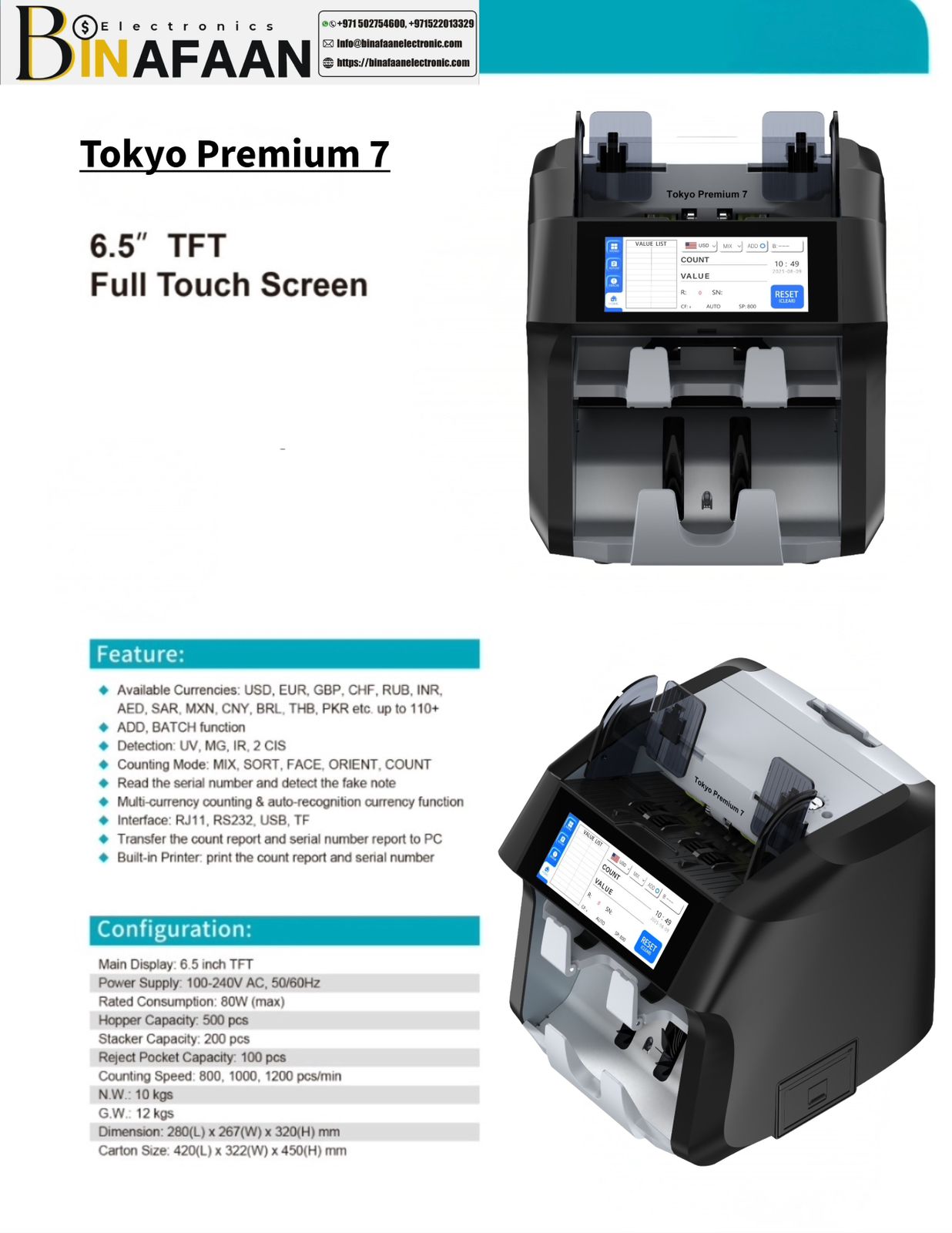 The Tokyo Premium 7 Currency Counting Machine is designed for fast, accurate, and secure cash handling. Equipped with a 6.5-inch full touch TFT screen, it offers an intuitive interface for smooth operation and real-time reporting.